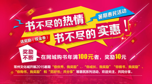 常州文化城开展2015暑期“你优秀,我奖励”、“你成长,我奖励”、“你捐书,我奖励”、“你购书,我奖励” 和“觅好书,共分享”等惠民系列活动,欢迎关注、共同分享。